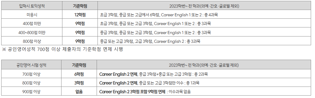 ② 2023학번 이후~ : 글로벌소통 영역에서 영어분반고사 성적에 따라 단계에 맞는 초급, 중급, 고급 표기가 된 과목으로 3과목, 반드시 3학년 이후에 듣게되는 Career English 1 또는 2 중 1과목은 포함 (9학점 이상)