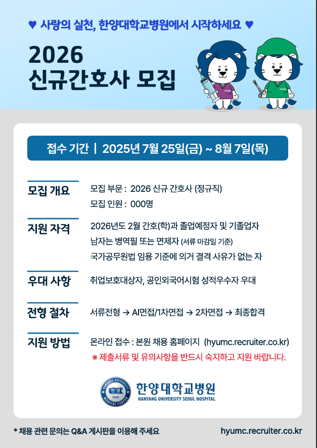 한양대학교병원(서울) 채용 | 2026년도 신규 간호사 모집
